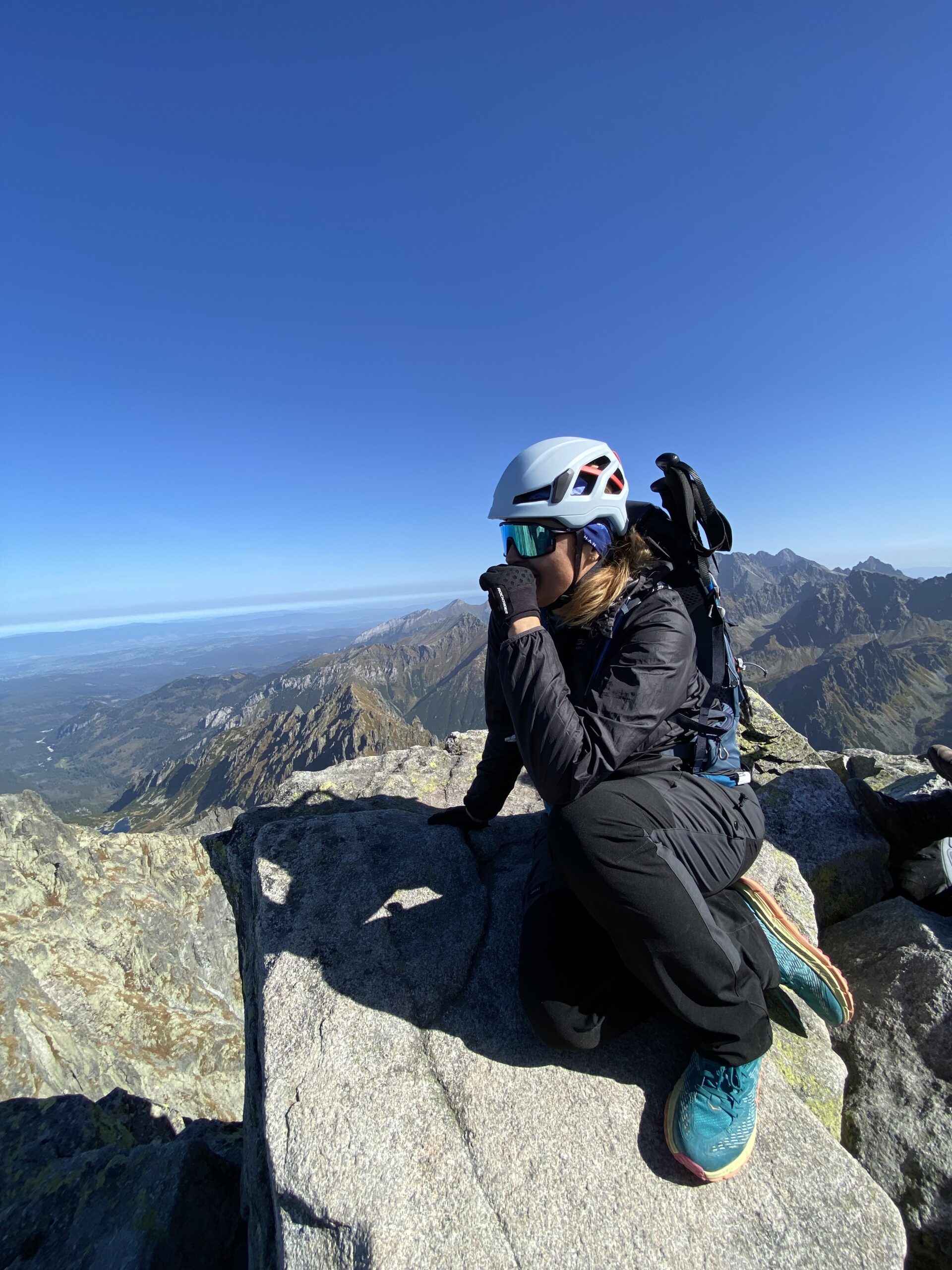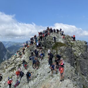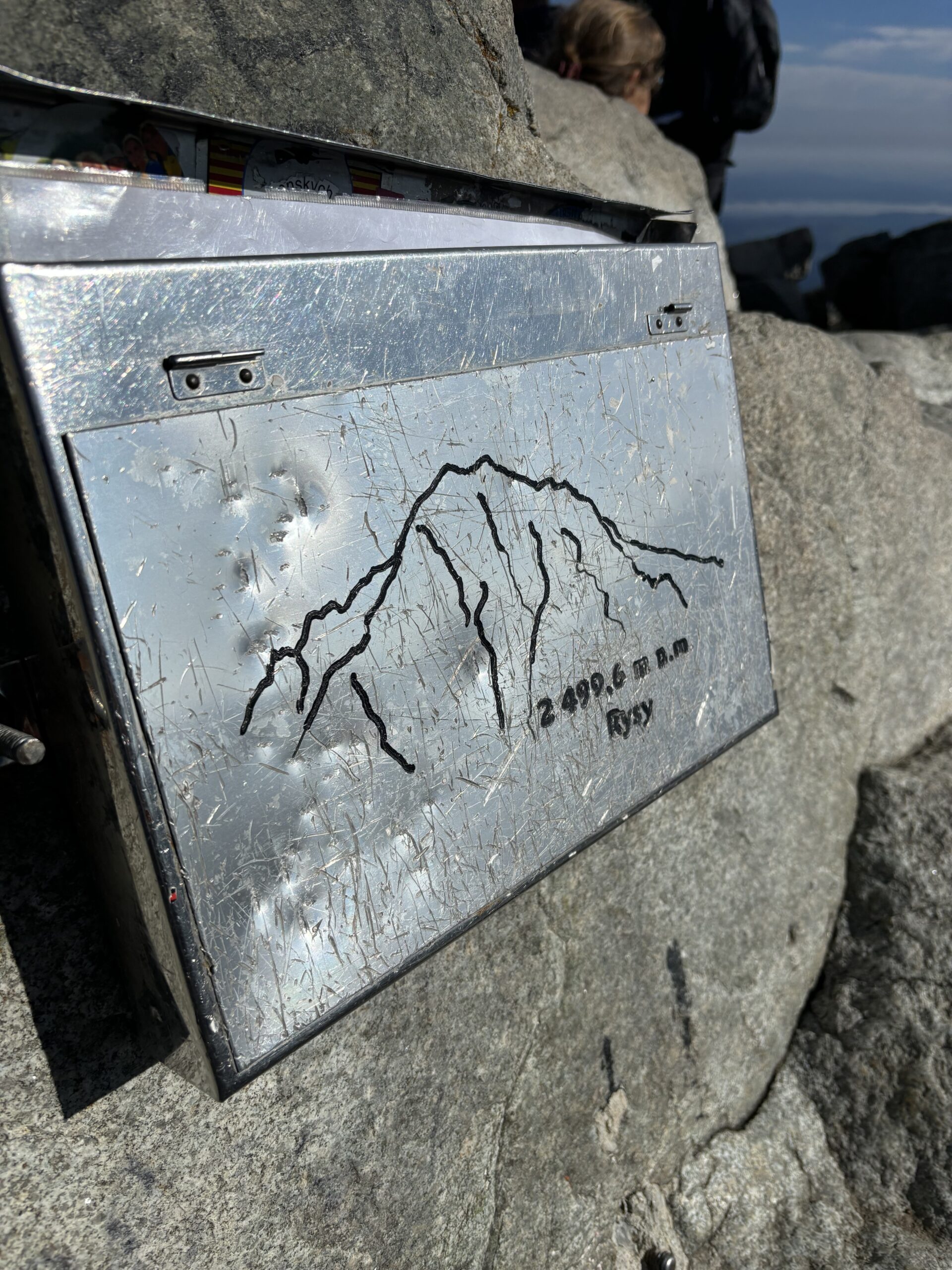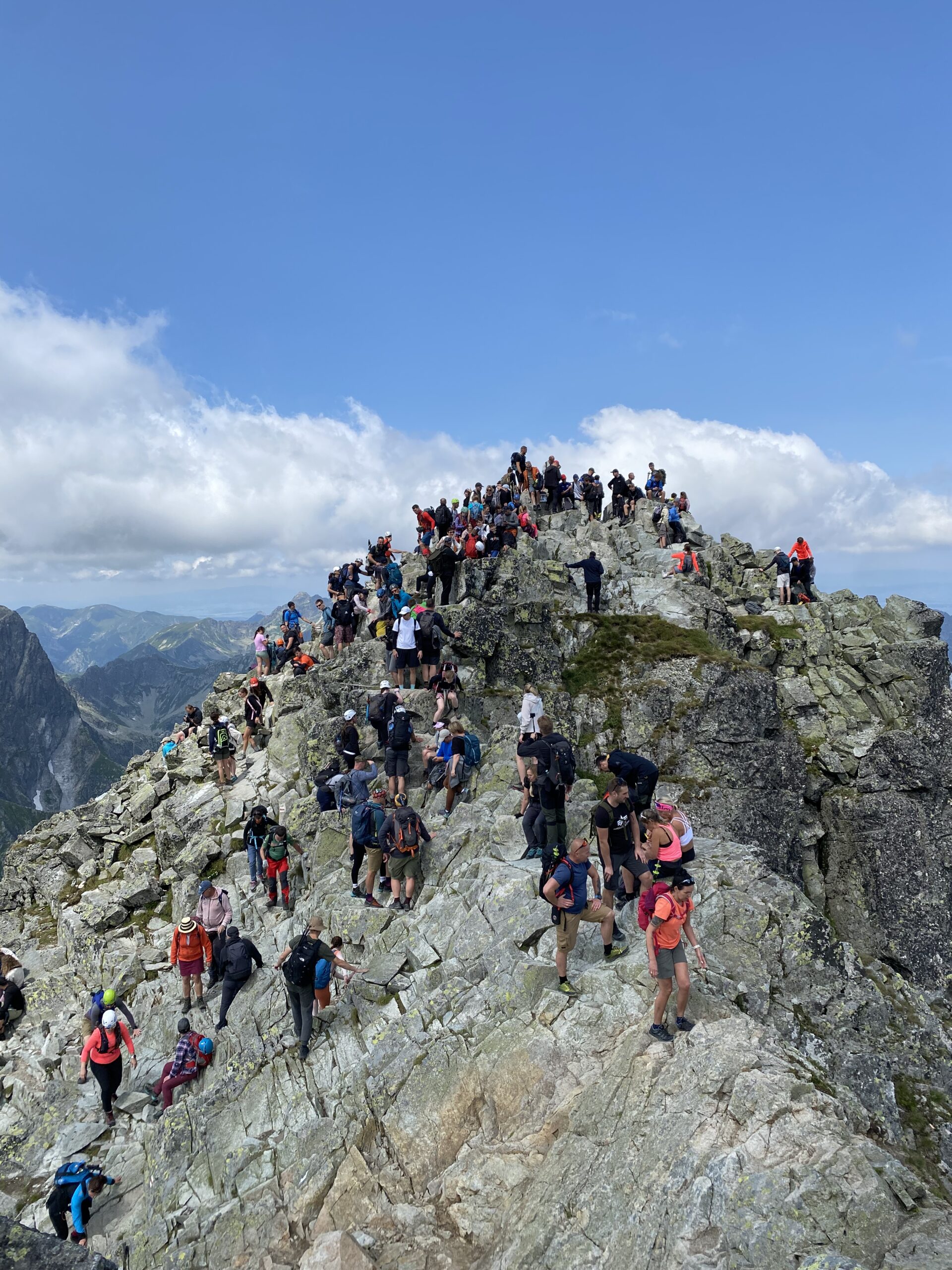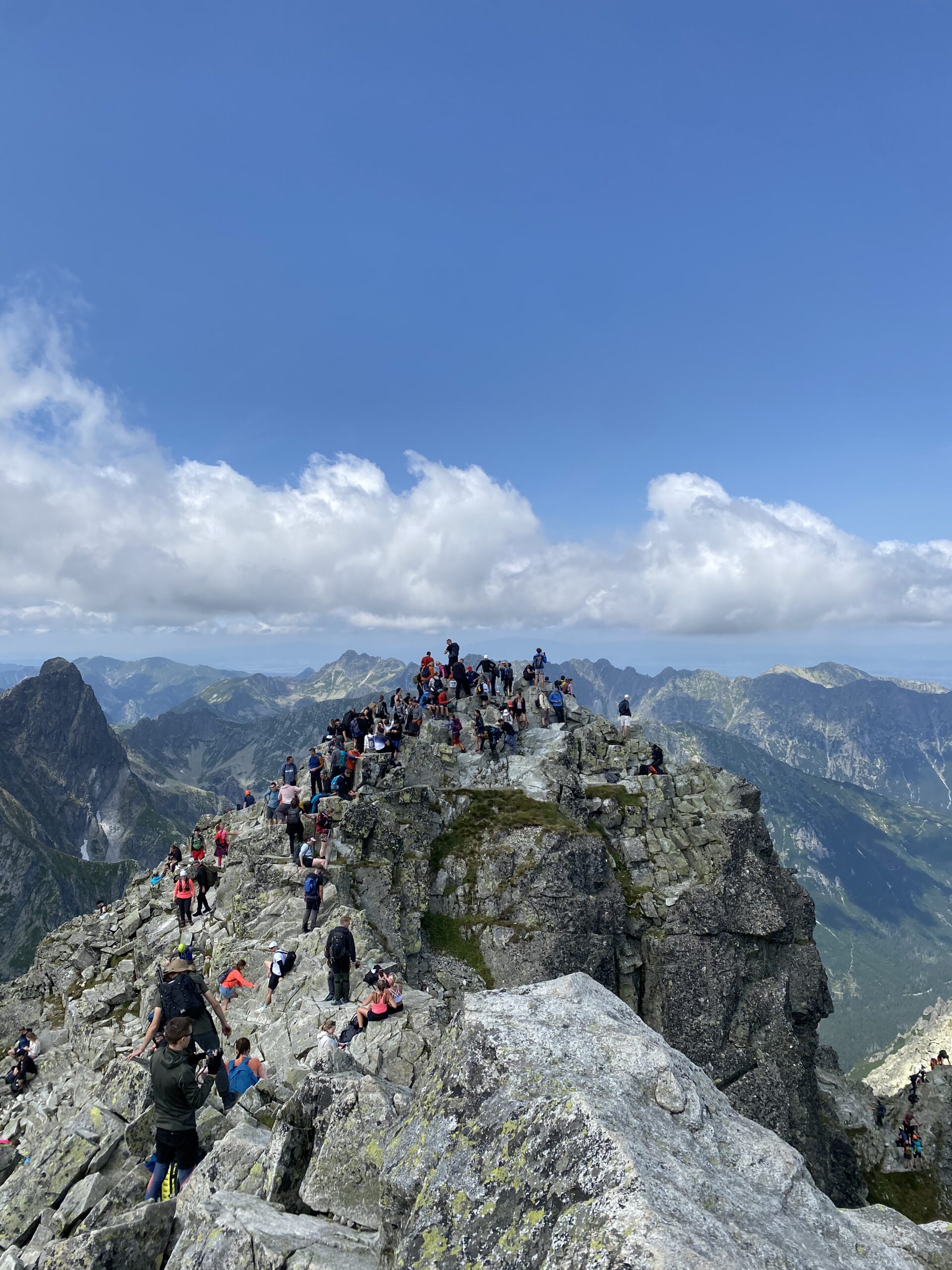 Osiągamy Rysy (2499 m n.p.m.), skąd rozciąga się spektakularny widok na Tatry polskie i słowackie.